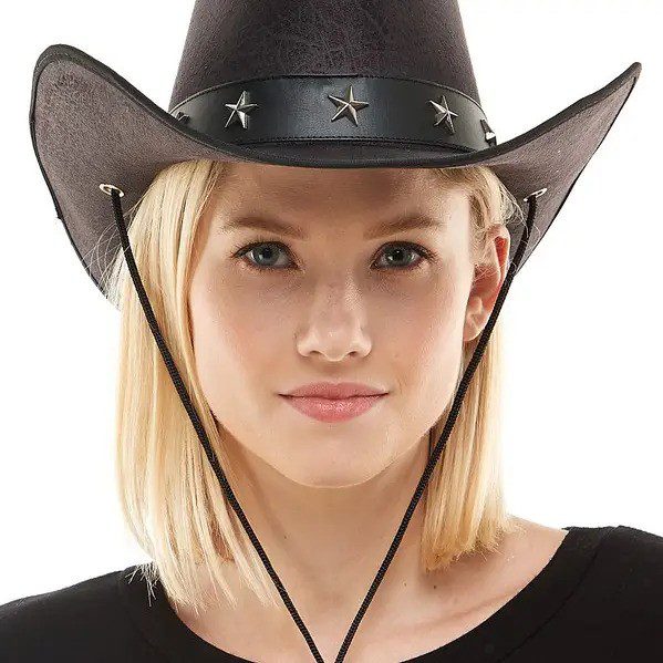 Black cowboy hat with a star-studded band and adjustable chin strap for a secure fit. Perfect for Western parties, country concerts, rodeos, and themed events — One Size Fits Most. Durable and stylish for any occasion.