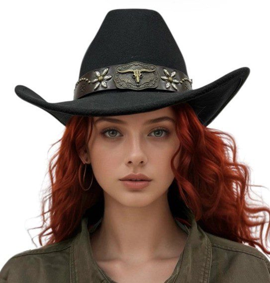 Showcase your Western spirit with this Western Star Longhorn Hat, featuring floral accents and a bull emblem. Ideal for rodeos, cowboy parties, Halloween, and country-themed events.