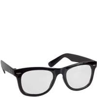 Plastic, balck-framed glasses with a 1950's superhero look.