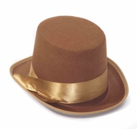 A brown top hat with a gold ribbon. A great accessory for a steampunk outfit.