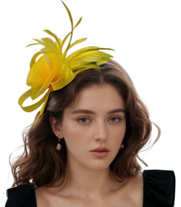 Brighten up any outfit with this yellow feather fascinator headband, perfect for spring, Easter, or Derby Day. Features playful mesh loops and feathery accents for a cheerful, stylish touch. A sunny choice for garden parties and festive events.