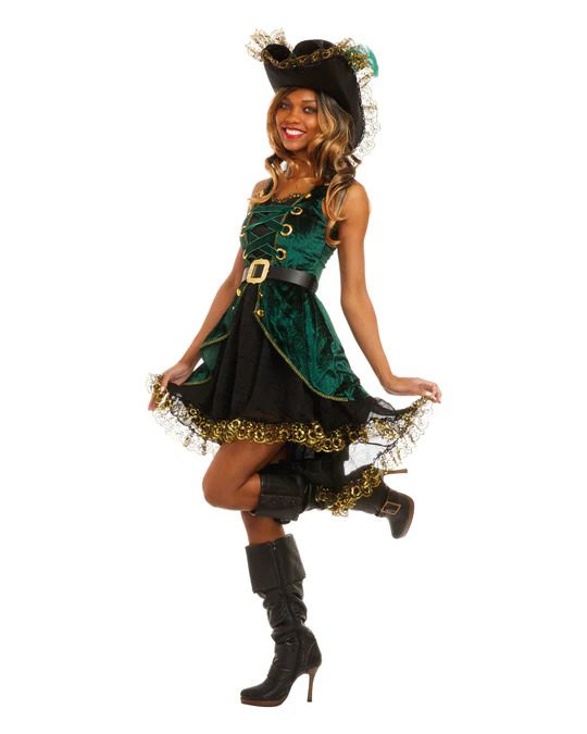 The EMERALD PIRATE LARGE costume features a detailed design crafted from high-quality materials, ensuring durability and comfort. Perfect for themed parties, it brings an authentic pirate look to your celebrations.