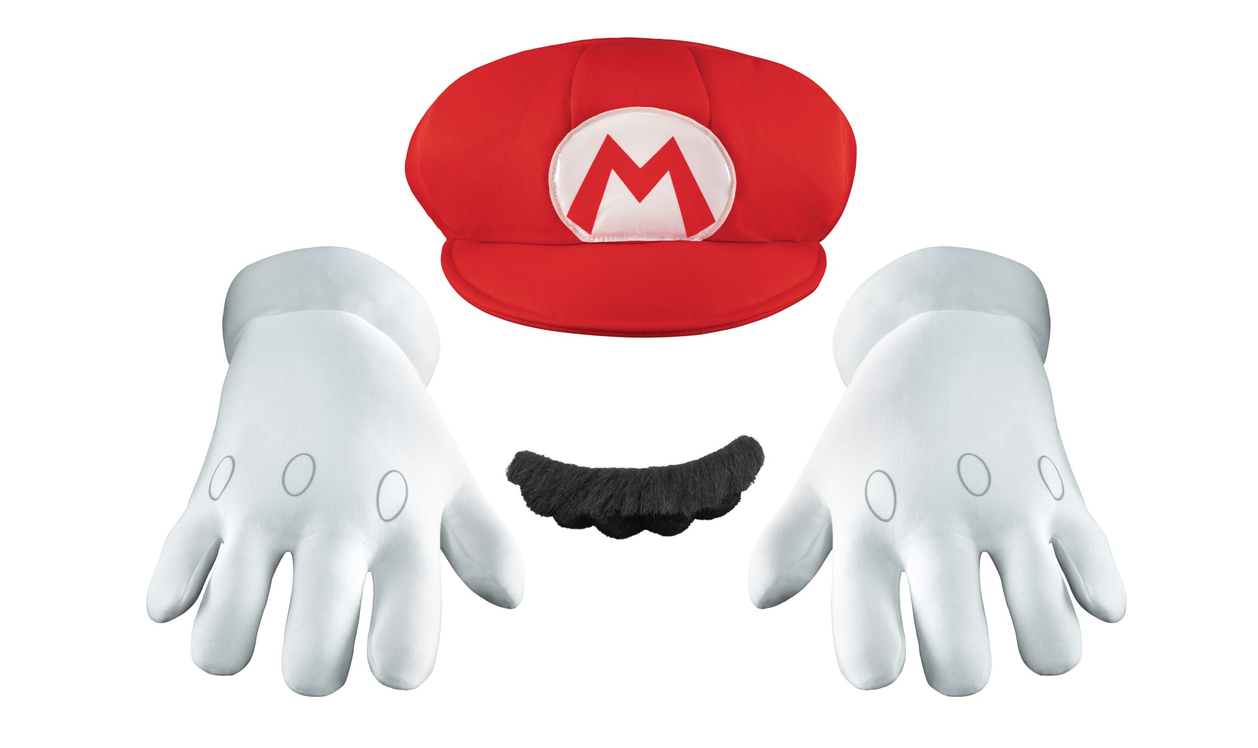 Mario accessory kit comes with the hat, pair of gloves and self-adhesive faux mustache.