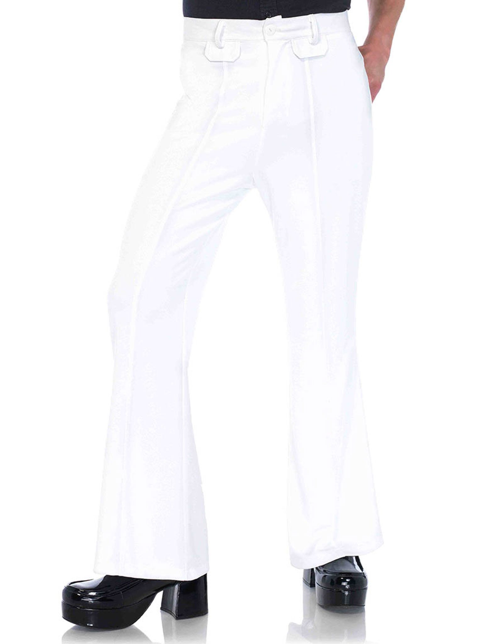 Step into the spotlight with these trendy men's bell bottom pants in a stylish white hue, perfect for channeling disco vibes and making a bold fashion statement. Elevate your wardrobe with a touch of retro flair – grab your pair now and unleash your inner groove!