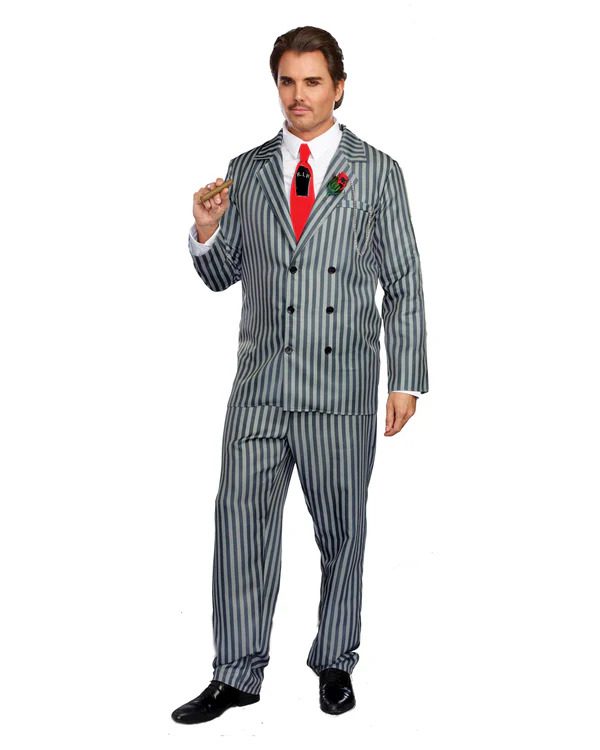The MR. FRIGHT PINSTRIPE XL costume features a spooky pinstripe design crafted from high-quality materials, making it an excellent choice for Halloween parties and themed events.