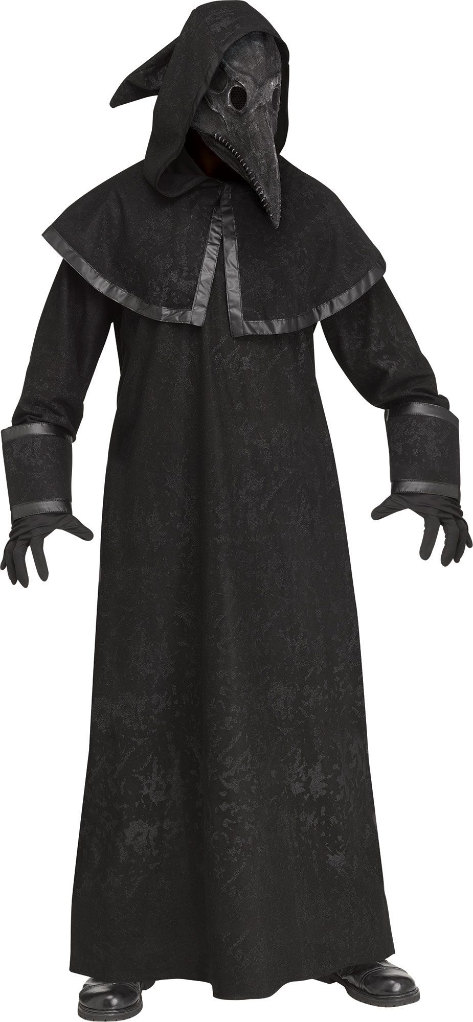 Complete costume features full-length distressed look robe with long sleeves and cuff finish, matching hood with capelet and faux leather trim, black poly gloves, and fearsome plague doctor half mask with back of head elastic.