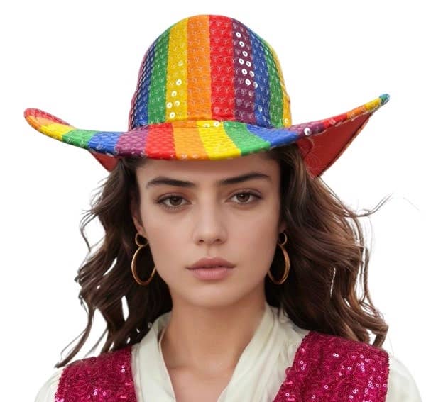 Shine bright at Pride events or parties with this Rainbow Sequin Cowboy Hat. Features colorful stripes and sparkling sequins—perfect for festivals, parades, and celebrations