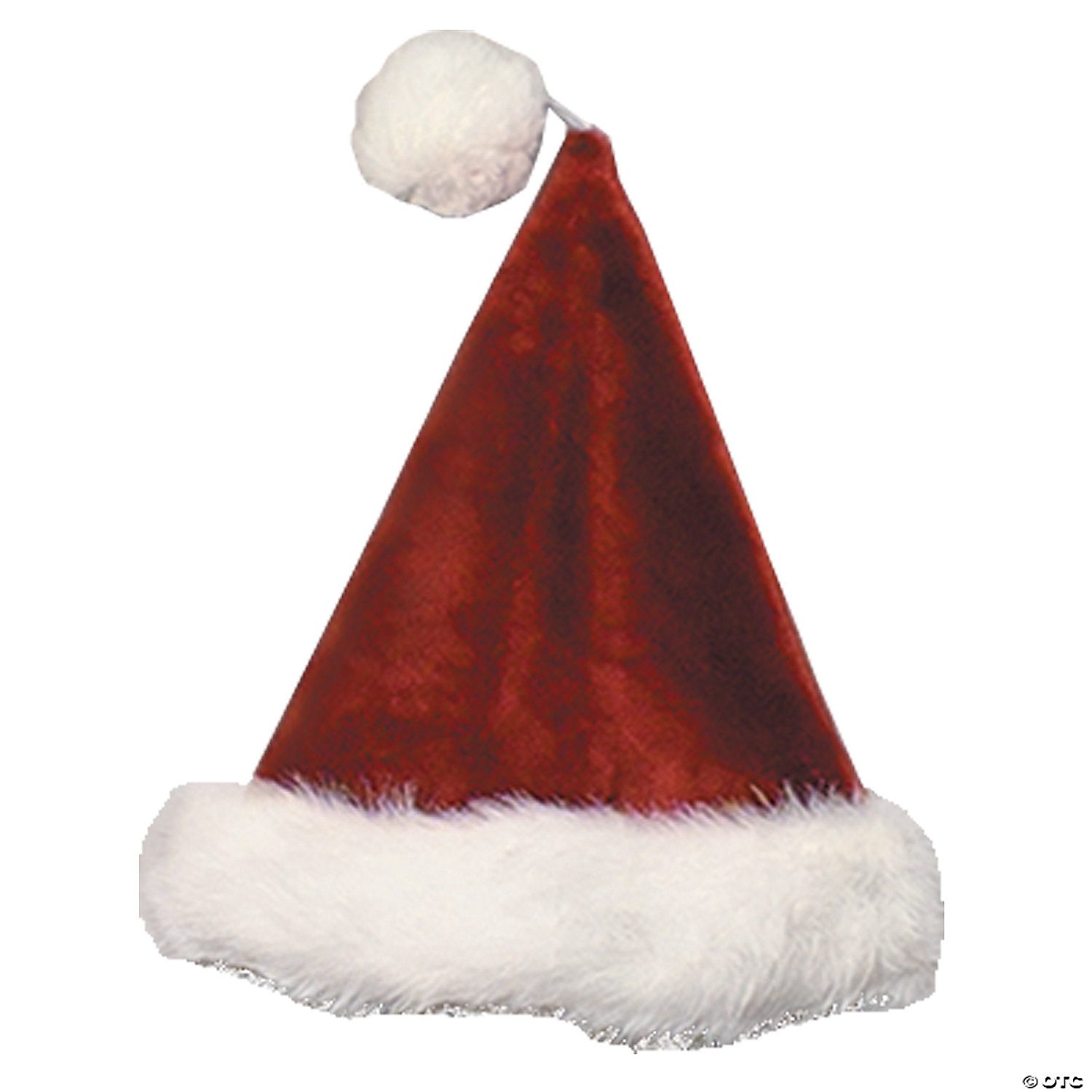 A very fancy Santa hat, made with velvet fabric, white fur trim, and a fluffy puff ball at the end.