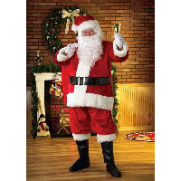 Deluxe Plush Suit with rich faux fur trim. Comes in reusable zipper bag. Complete Santa Suit includes zippered jacket, pants with pockets, 2 boot tops, belt with buckle, hat, beard and wig.
