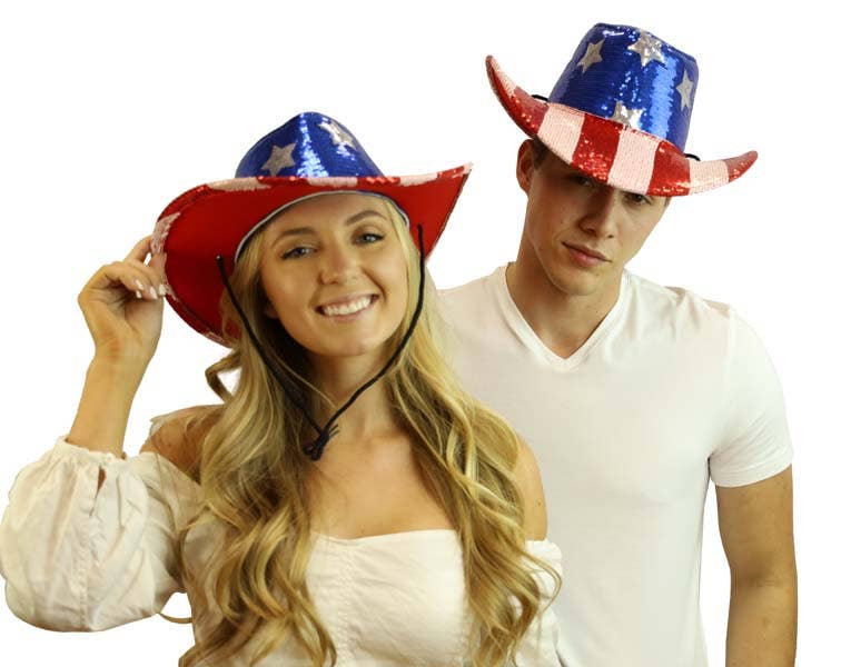 This USA Sequin Cowboy Hat features sparkling red, white, and blue sequins with a stars-and-stripes design. Perfect for 4th of July, patriotic parties, festivals, or themed events, it adds a bold American flair to any outfit. Great for summer celebrations and costume fun.