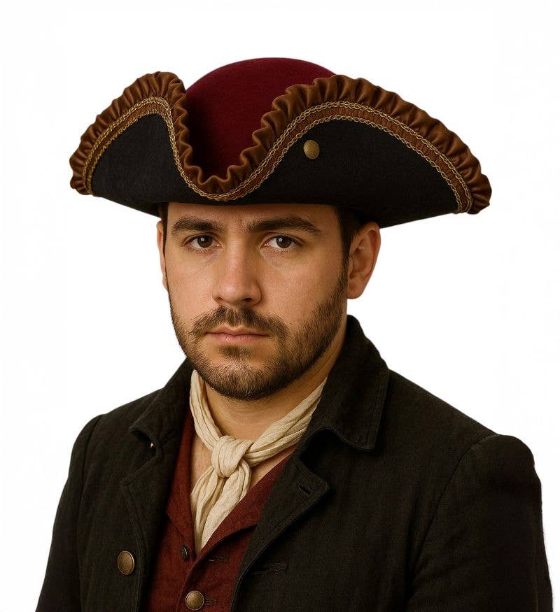 This Velvet Burgundy Pirate Tricorn Hat features plush burgundy velvet, brown ruffled trim, and gold accents for a luxurious pirate style. Perfect for Halloween, pirate parties, theatrical costumes, or nautical events, it adds elegance to any swashbuckler ensemble. Great for adventure and talk-like-a-pirate day.